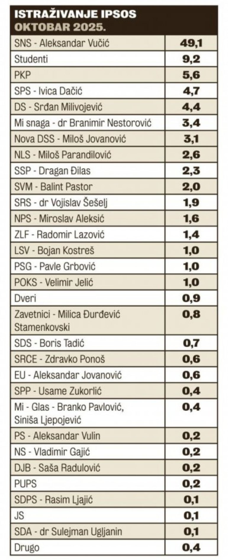 PREMA najnovijem omnibus istraživanju za oktobar mesec prestižne agencije Ipsos, da se parlamentarni izbori u Srbiji održavaju u nedelju 2. novembra, lista Srpske napredne stranke Aleksandra Vučića osvojila bi 49,1 odsto glasova, dok bi tzv. "studentska lista" dobila 9,2 procenata podrške građana.