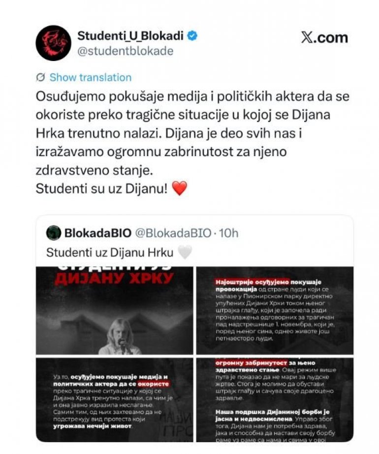 - Osuđujemo pokušaje medija i političkih aktera da se okoriste preko tragične situacije u kojoj se Dijana Hrka trenutno nalazi. Dijana je deo svih nas i izražavamo ogromnu zabrinutost za njeno zdravstveno stanje. Studenti su uz Dijanu!