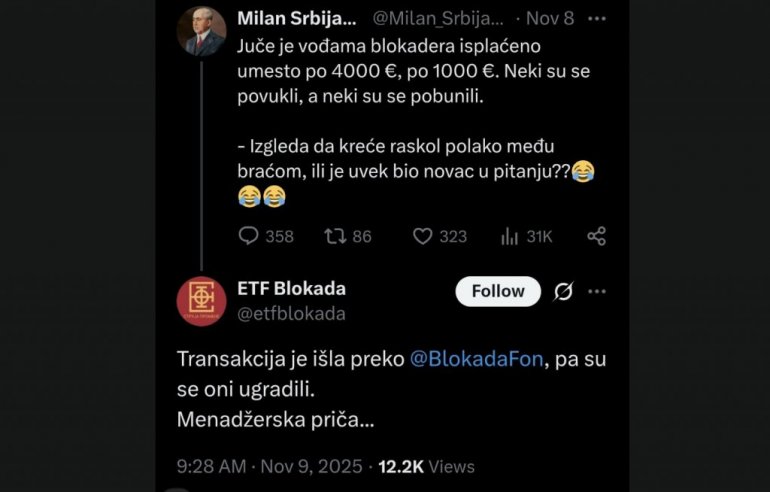 - Juče je vođama blokadera isplaćeno po 4000 evra, po 1000 evra. Neki su se povukli, a neki pobunili. Izgleda da kreće raskol polako među braćom, ili je uvek bio novac u pitanju - piše u objavi.