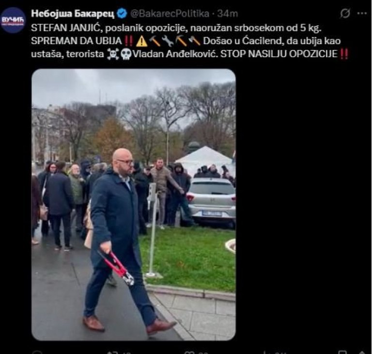 - Stefan Janjić, poslanik opozicije, naoružan srbosekom od 5 kg. Spreman da ubija. Došao u Ćacilend, da ubija kao ustaša, terorista. Stop nasilju opozicije - napisao je Bakarec na mreži X.