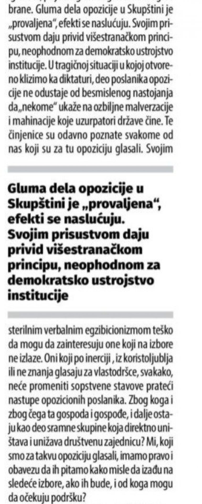 "Gluma dela opozicije u Skupštini je provaljena, efekti se naslućuju. Svojim prisustvom daju privid višestranačkom principu, neophodnom za demokratsko ustrojstvo isntitucija".