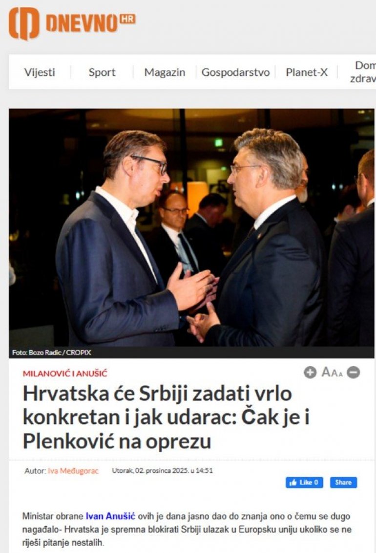 Naime, portal Dnevno.hr objavio je tekst s naslovom"Hrvatska će Srbiji zadati vrlo konkretan i jak udarac" u kom se citira izjava ministra odbrane te zemlje, Ivana Anušića, a u kojoj on otvoreno priznaje kako je Zagreb spreman da "Srbiji blokira ulazak u Evropsku uniju (EU)".
