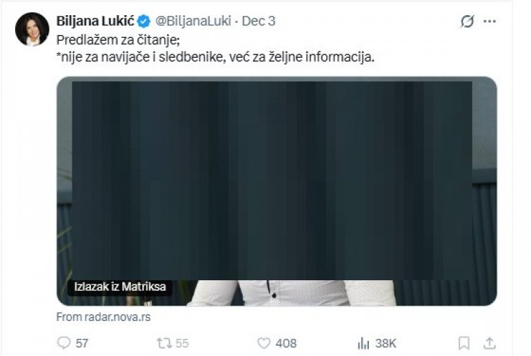 - Predlažem za čitanje. Nije za navijače i sledbenike, već za željne informacija - napisala je ona na Iksu i podelila tekst reditelja blokadera Stevana Filipovića.