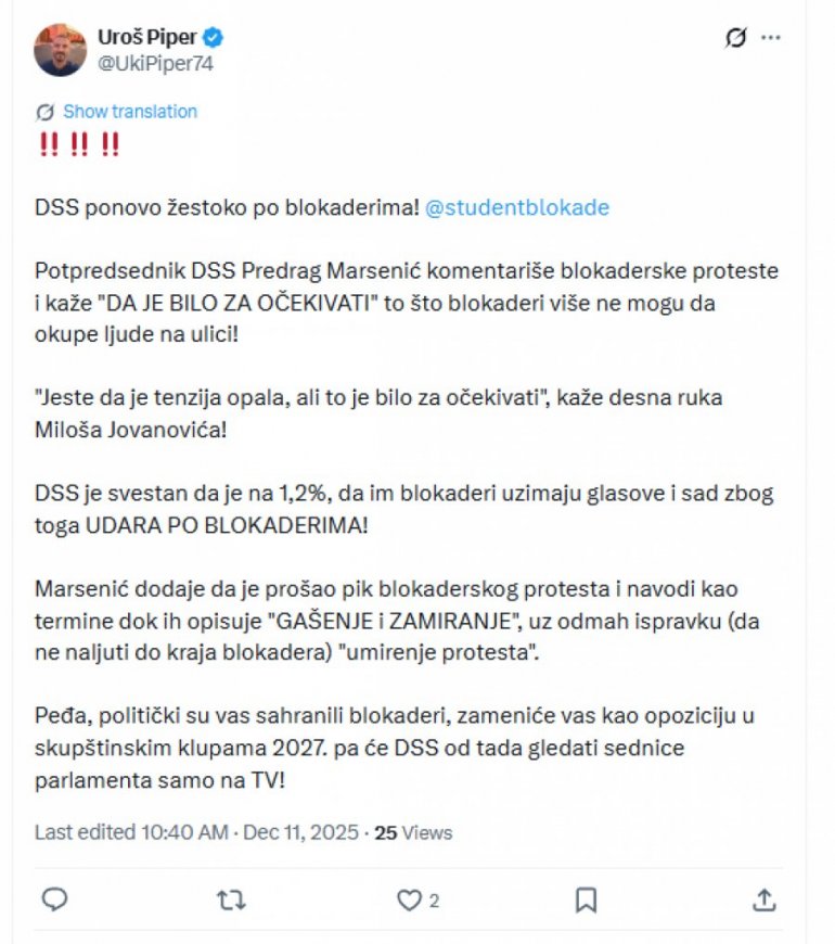 - Marsenić dodaje da je prošao pik blokaderskog protesta i navodi kao termine dok ih opisuje "GAŠENjE i ZAMIRANjE", uz odmah ispravku (da ne naljuti do kraja blokadera) "umirenje protesta". Peđa, politički su vas sahranili blokaderi, zameniće vas kao opoziciju u skupštinskim klupama 2027. pa će DSS od tada gledati sednice parlamenta samo na TV!