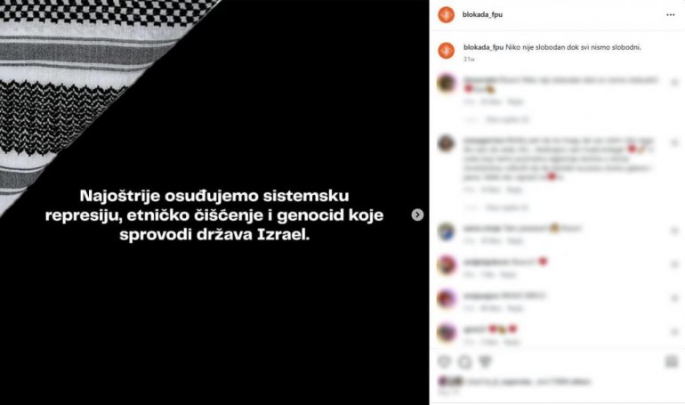 Cionizam – ideologija na kojoj počiva izraelski režim – jeste kolonijalna i nasilna politika koja desetlećima uništava živote Palestinaca. Kada Skupština Beograda menja imena ulica po želji izraelske ambasade – ulicu u Zemunu naziva po Teodoru Herclu, ocu ideje stvaranja jevrejske države i osnivaču cionizma, to nije „neutralan čin“ – to je politička poruka podrške okupaciji. ... Kao i mnoge generacije pre nas, znamo da je borba za slobodnu Palestinu deo šire borbe protiv kolonijalizma, aparthejda i fašizma – ovde i svuda. Zahtevamo: Prekid svih vojnih i političkih odnosa sa izraelskim režimom. Jasno izražavanje Srbije protiv genocida. Pozivamo sve studente, radnike i slobodnomisleće ljude da dignu glas.