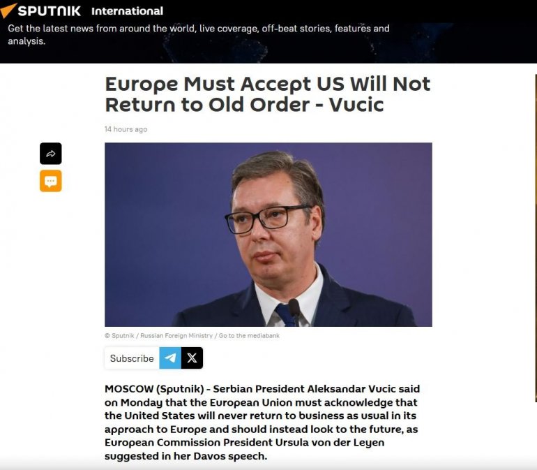 Sputnjik je u prvi plan stavio Vučićevo upozorenje evropskim liderima da je iluzija očekivati „povratak stare Amerike“ i da se međunarodni odnosi danas vode isključivo interesima, a ne nostalgijom.