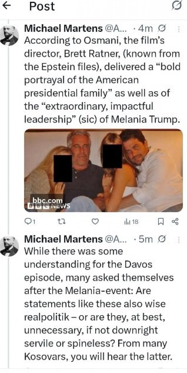 NEMAČKI novinar Mihael Martens oglasio se na društvenoj mreži "Iks" povodom toga što Vjosa Osmani veliča predsednika SAD Donalda Trampa.