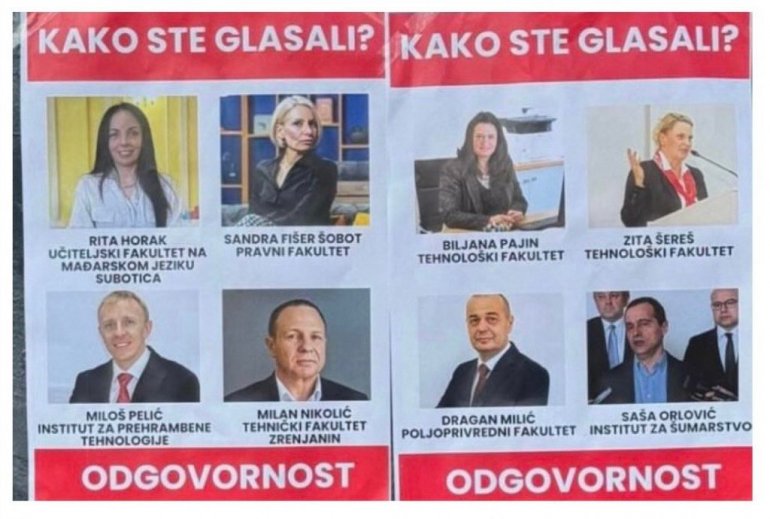 Kako smo se uverili, pre nedelju dana, na kampusu, autobuskim stajalištima i javnim mestima pojavili su se plakati i nalepnice sa imenima i prezimenima univerzitetskih profesora, uz poruke koje direktno ugrožavaju njihovu bezbednost i čast. Ovakvo targetiranje dela akademske zajednice usledilo je nakon tajnog glasanja Senata, što je po zakonu i statutu Univerziteta – potpuno legalno!