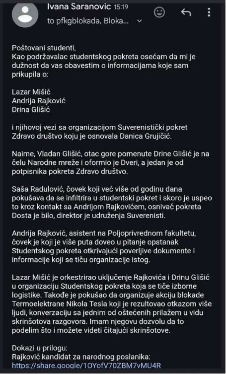 Naime, u mejlu u koji su "Novosti" imale uvid, blokaderka Ivana Šaranović alarmirala je sve fakultete i optužila grupu sa Poljoprivrednog fakulteta u Beogradu za sponu i bliske veze sa opozicijom - novoformiranim pokretom "Zdravo društvo" Danice Grujičić, Vladanom Glišićem, osnivačem Dveri, te Sašom Radulovićem i Andrijom Rajkovićem iz "Dosta je bilo".