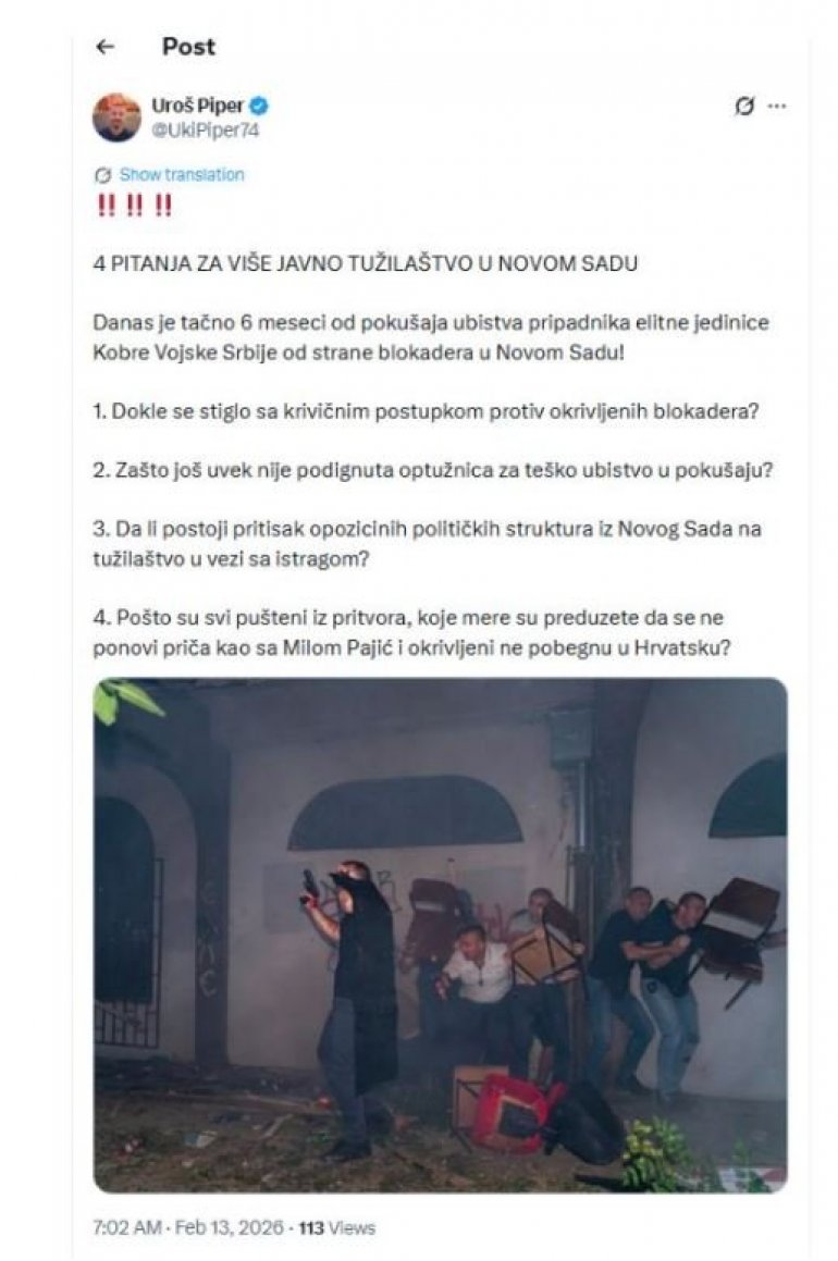 DANAS je tačno 6 meseci od pokušaja ubistva pripadnika elitne jedinice Kobre Vojske Srbije od strane blokadera u Novom Sadu, podsetio je novinar Uroš Piper.