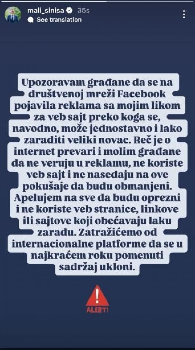 - Reč je o internet prevari i molim građane da ne veruju u reklamu, ne koriste veb sajt i ne nasedaju na ove pokušaje da budu obmanjeni. Apelujem na sve da budu oprezni i ne koriste veb stranice, linkove ili sajtove koji obećavaju laku zaradu. Zatražićemo od internacionalne platforme da se u najkraćem roku pomenuti sadržaj ukloni - navodi se u objavi ministra Malog na Instagramu.