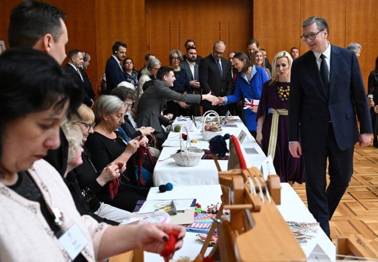 - Stara srpska poslovica kaže "kuća ne leži na zemlji, nego na ženi". To je nit koja spaja ruke naših majka i baka, pokazujemo da je nematerijalno nasleđe živa snaga Srbije. Ovom izložbom pokazujemo da je nematerijalno nasleđe živa nit Srbije. Posebnu zahvalnost dugujemo Etno mreži. Donekle sam srećan što, čini mi se, kada postoji neki problem, učinim šta mogu. Nisam srećan što ne vidim sve predsednike opština. Više od 1.000 žena prošlo je obuke. Iza svih stavki i brojki, stojite vi. Naše rukotvorine krasile se međunarodne izložbe od Dubaija do Šangaja. Kulturna diplomatija nije samo u rečima, već u malim, pažljivo izabranim detaljima. Podaci koje sam dobio juče, a koji se tiču zanata, veoma su poražavajući, odnose se na mladu generaciju. Naša državnost i državotvornost počivaju na našoj kulturi. Sa ponosom proglašavam izložbu otvorenom. Živela Srbija - kazao je Vučić.