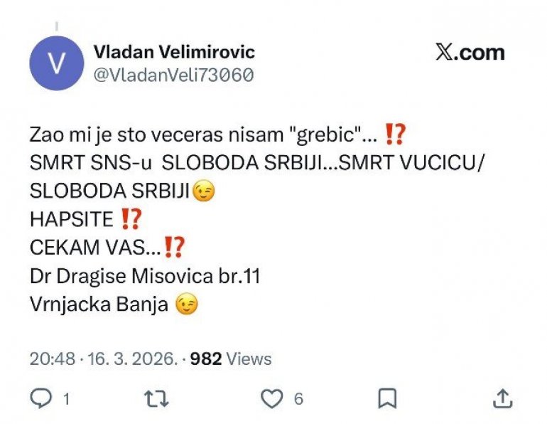 NOVE i jezive pretnje predsedniku Srbije, Aleksandru Vučiću osnavule su na društvenim mrežama. Ovoga puta upućene su od strane blokadera Vladana Velimirovića.