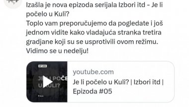 - Izašla je nova epizoda serijala Izbori itd - Je li počelo u Kuli? Toplo vam preporučujemo da pogledate i još jednom vidite kako vladajuća stranka tretira građane koji su se usprotivili ovom režimu. Vidimo se u nedelju - navode u objavi na mreži H.