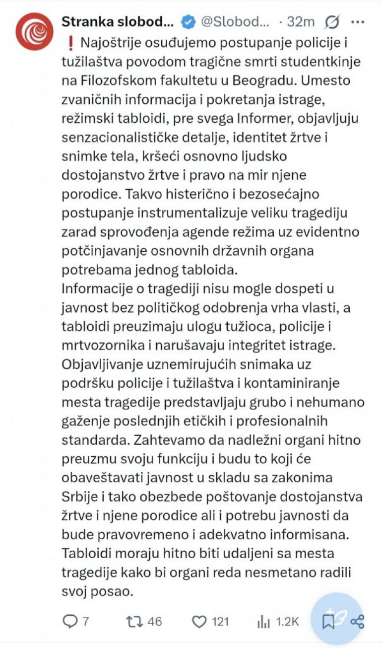- Najoštrije osuđujemo postupanje policije i tužilaštva povodom tragične smrti studentkinje na Filozofskom fakultetu u Beogradu. Umesto zvaničnih informacija i pokretanja istrage, režimski tabloidi, pre svega Informer, objavljuju senzacionalističke detalje, identitet žrtve i snimke tela, kršeći osnovno ljudsko dostojanstvo žrtve i pravo na mir njene porodice. Takvo histerično i bezosećajno postupanje instrumentalizuje veliku tragediju zarad sprovođenja agende režima uz evidentno potčinjavanje osnovnih državnih organa potrebama jednog tabloida.