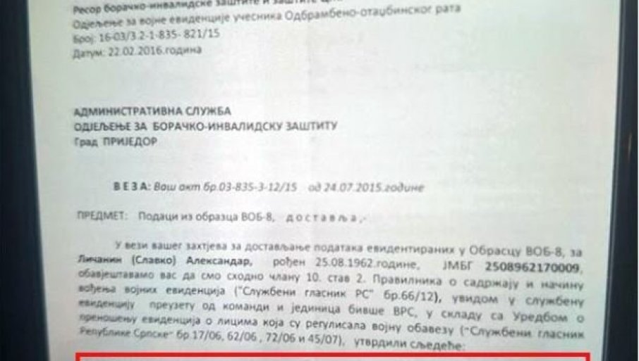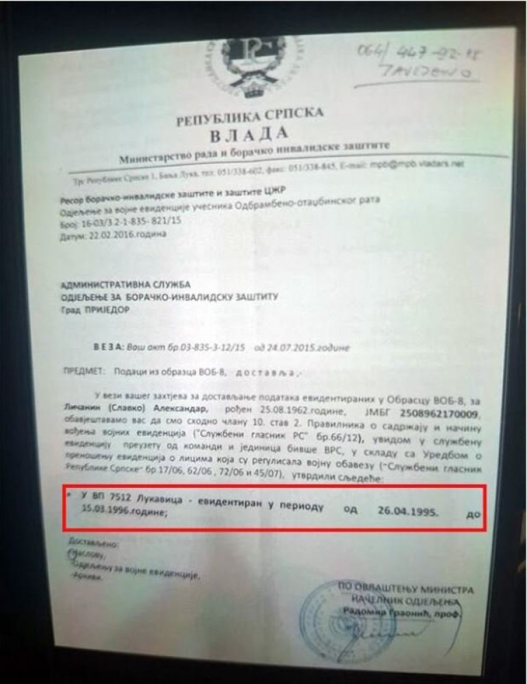 Uz to, u zvaničnoj evidenciji Ministarstva za rada i boračko invalidske zaštite Republike Srpske Ličanin je regulisao vojnu obavezu tek u periodu od 26. aprila 1995. do 15. marta 1996. godina (vojna pošta Lukavica).