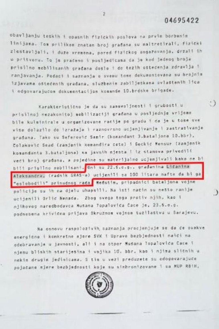 - Oni su 22. 6. ove godine građanina Ličanina Aleksandra (radnika GRAS-a) ucenili sa 100 litara nafte da bi ga "oslobodili" prinudnog rada. Međutim, pripadnici bataljona vojne policije su ih na delu uhapsili. Na isti način su nešto ranije ucenili i Orlić Nenada. Zbog svega toga protiv njih, kao i njihovog naredbodavca Mušana Topalovića Cace je 23. 6. ove godine podnesena krivična prijava Okružnom vojnom tužilaštvu u Sarajevu - navodi se u ovoj poverljivoj belešci iz 1993. godine.